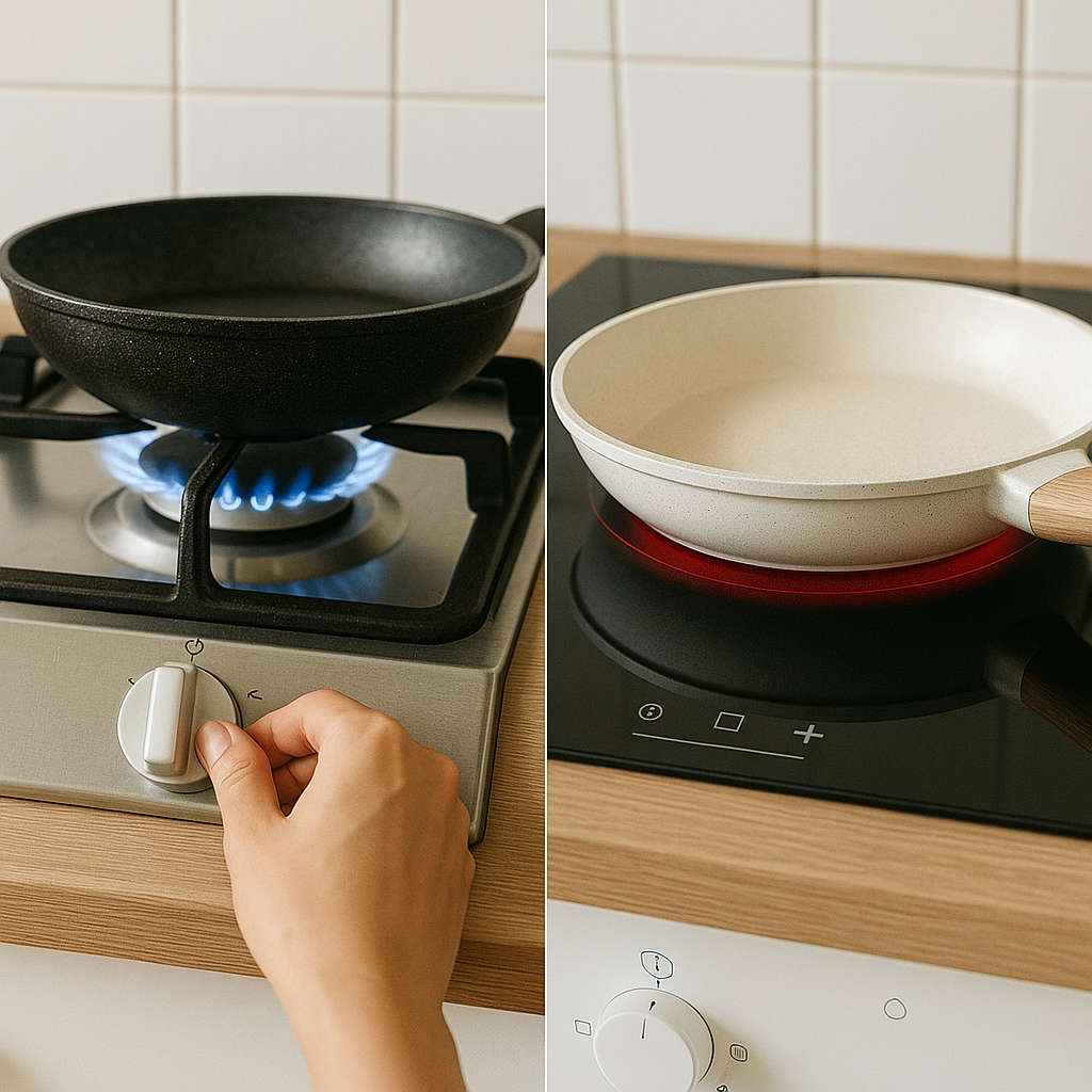 가스는 직접 불을 이용하고, 인덕션은 불꽃 없이 전기를 사용합니다.