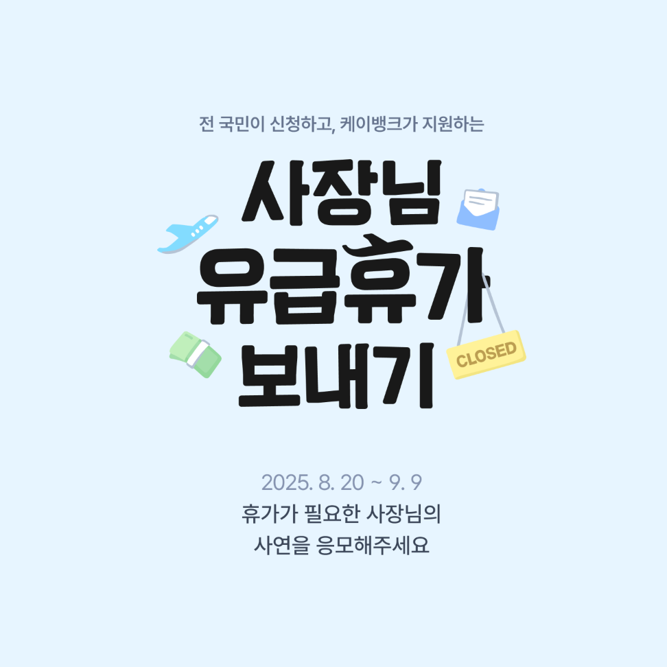케이뱅크 사장님 유급휴가 보내기 프로젝트, 바로 최대 300만 원까지 휴가비를 지원해주는 특별한 이벤트가 열렸기 때문이죠. 단순 이벤트가 아니라, 실제로 사장님의 가게 운영과 휴식을 동시에 생각한 지원 프로그램이라는 점에서 눈길을 끌고 있습니다.